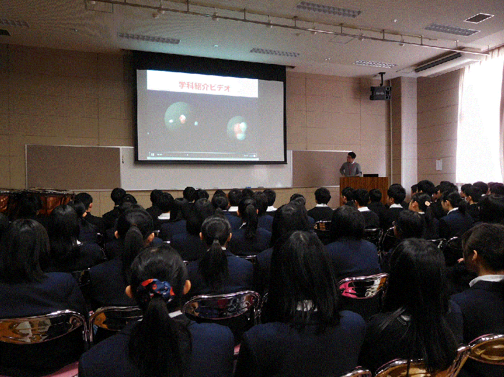 12月27日(水)、視聴覚教室にて二水版クリスマスレクチャーが開かれました。およそ90名の1,2年生が参加し、本校の卒業生で東京大学大学院の桶作愛嬉さんと京都大学の西島奈央さんによる講演が行われました。桶作さんの3ヶ月間スイスで研究した経験や、西島さんのインドネシアでのフィールドワークの様子を聞き、生徒達は大学で行われるグローバルな研究活動への興味・関心を高めていました。