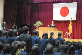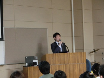 また、堀田副校長の御礼のことばに続いて、1年生を対象に岡田優介先生が「文武両道のすすめ」と題して講演されました。岡田先生はプロバスケットボール選手のかたわら、公認会計士試験に合格し、現在、非常勤で会計事務所勤務をされています。