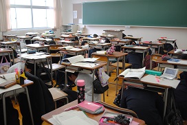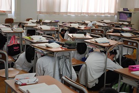 11月18日(月)の昼食時間に今年度2回目の地震防災訓練を実施しました。今回は校舎内のどの場所にいても、どんな時でも安全行動をとることができるよう、事前に具体的な日時を知らせずに行いました。前もってそれぞれの場所での安全確保の方法を指示したプリントを配布し、訓練後に、指示通り安全行動がとれたかどうかアンケートをとりました。昼食時間で放送が聞こえにくいという反省点もありましたが、9割以上の生徒が指示された安全行動をとることができたと答えました。