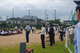 その後、各学年に分かれて消火訓練、避難梯子での避難、起震車での体験などが予定されていましたが、あいにくの悪天候のため、中止になりました。