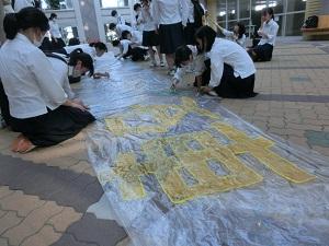 “例年とは異なる状況を逆に良い方向に変えて積極的に活動し、思い切って新しいことに挑戦していきたい、柔軟な発想で活躍できる学校にしたい。”という願いを込めた生徒会前期のスローガン「進取(しんしゅ)果敢(かかん)~羽ばたけ二水生 未来へ向けて」のもと、生徒会役員が新学期が始まったら各ホームで取り組む階段アート、ビニールアート、クラス旗の下準備を始めました。