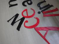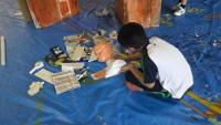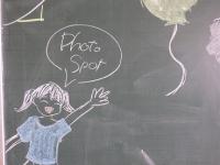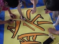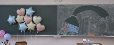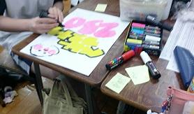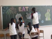 美術室には綺麗な黒板アート! 一見の価値あり。また、制作コーナーもあります。
