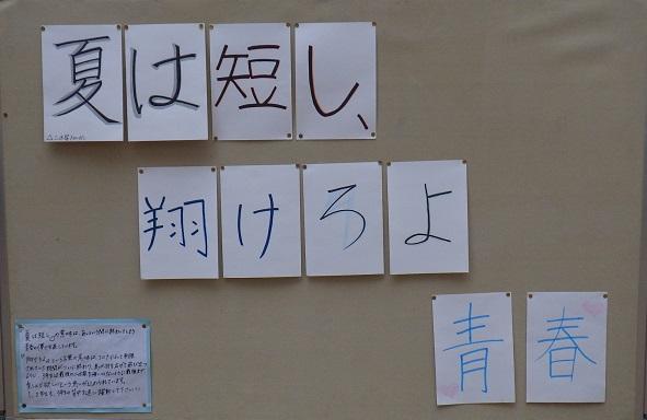 “例年とは異なる状況を逆に良い方向に変えて積極的に活動し、思い切って新しいことに挑戦していきたい、柔軟な発想で活躍できる学校にしたい。”という願いを込めた生徒会前期のスローガン「進取(しんしゅ)果敢(かかん)~羽ばたけ二水生 未来へ向けて」のもと、生徒会役員が新学期が始まったら各ホームで取り組む階段アート、ビニールアート、クラス旗の下準備を始めました。
