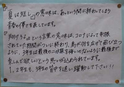 8月29日(土)に第72回二水祭が行われました。例年よりも多くのことに配慮した二水祭。多くの制限の中で、生徒たちは様々な工夫で対応していました。二水祭のスローガン「繋 #ひとつになろう You _ I」のもと、二水祭をやり遂げることができました。