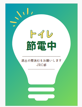 二水生の環境への意識を高めるため、JRC部では節電・節水のポスターを数種類作成し、トイレの手洗い場などにはりました。