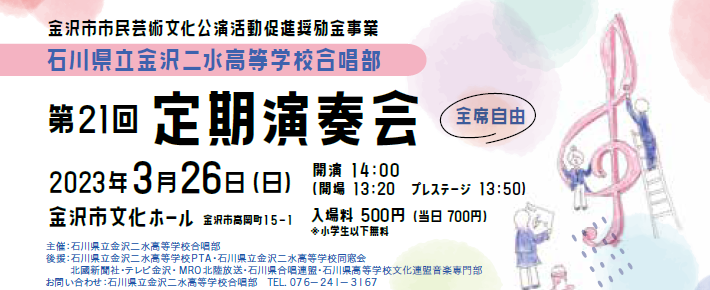 3月26日㈫18:30~(プレステージ18:20~)金沢市文化ホールにおいて石川県立金沢二水高等学校合唱部第22回定期演奏会を開催する運びとなりました。令和6年能登半島地震で被災した皆様の少しでも役に立てるように、演奏会当日は募金箱を設置し、チケット収入やOBOG協賛金の一部と合わせて義援金を送る予定です。また被災された方で演奏会観覧希望の方がいらっしゃれば、無料でご招待いたしますので、下記申込よりぜひご応募ください。今回は県内高校で音楽教諭としてご活躍中の本校合唱部65期卒業生、大久保翔貴先生を客演指揮としてお招きし、広くOBOGを募って合同ステージを設ける予定で、5年ぶりとなるマスクなしの演奏会です。OBOGの方もまだまだ募集中なので1曲からでもステージでご一緒できる方は今月中に申し込みをお願いします。チケットは500円(当日700円)で販売しておりますので、本校部員から購入するか、下記に必要事項を記入していただければ対応いたします。たくさんのご来場お待ちしています!