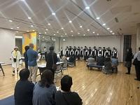 一昨年度、サントリー1万人の第九に招待されて大阪城ホールで歌ってきたご縁で、MRO北陸放送から大阪万博1万人の第九にも参加してもらえないかとオファーを受け、万博初日に新2,3年生の部員が招待されて前日の練習会と当日の本番に参加しました。前日の練習会では各地域のMBS放送系列のテレビ局が招待した高校生の合唱団中心で、各県の強豪校も参加していて、県外のレベルの高い学校と一緒に練習することで大きな刺激をもらったようでした。同行したMROの久々江アナウンサーからインタビューを受けたりもしました。