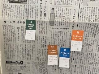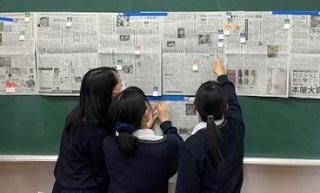 2年生の「総合的な探究の時間」のテーマは「深める」です。論理的な思考力や活用力を高めるために、自ら課題を設定し 「思考の過程」 を大事にしながら探究活動に取り組みます。今年は、少人数グループの探究活動によりビジネスプランを作成し、情報収集力、分析力、課題解決力、論理的思考力を育成します。日本政策金融公庫などの専門家の講義を受け、高校生ビジネスプラングランプリに参加する予定です。スタートは「今の自分に何が出来るか」という狭い視点ではなく、「今、何が世の中に求められているか」という幅広い視点から考えるため、新聞記事に「SDGs17の課題の付箋」を貼りながらグループ活動を行いました。