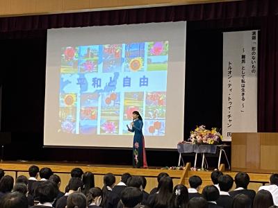 「形のないもの~”難民”として私は生きる~」と題して、講師のトルオン・ティ・トゥイ・チャンさんにお話しいただきました。過酷な状況の中、真っ直ぐ前を向いて歩いていく、という会場全体が心打たれる内容でした。