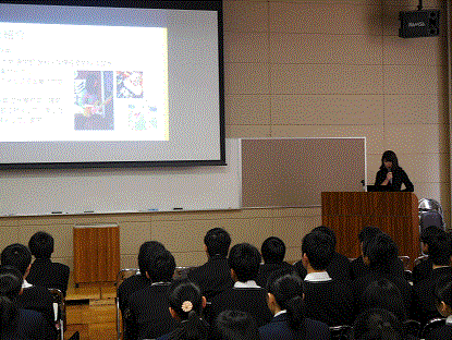 12月27日(水)、視聴覚教室にて二水版クリスマスレクチャーが開かれました。およそ90名の1,2年生が参加し、本校の卒業生で東京大学大学院の桶作愛嬉さんと京都大学の西島奈央さんによる講演が行われました。桶作さんの3ヶ月間スイスで研究した経験や、西島さんのインドネシアでのフィールドワークの様子を聞き、生徒達は大学で行われるグローバルな研究活動への興味・関心を高めていました。