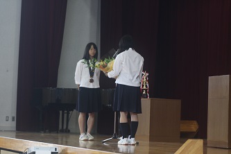 地域社会と女性と女児の生活向上を目的とした奉仕団体「ソロプチミスト金沢-くろゆり」会長の高桑みな子様より、奉仕活動をしている本校に支援金が授与されました。生徒を代表して生徒会長の堀井紗葉さんがお礼の言葉を述べた後、国際ソロプチミストアメリカ連盟のVRA賞(ボランティア活動に従事し、地域や世界をよりよくするために献身的な14歳から17 歳の女性を対象にするもの)に応募した2年生の田上彩花さんと「夢を生きるアートコンテスト」に応募した美術部にもくろゆり賞が贈られました。