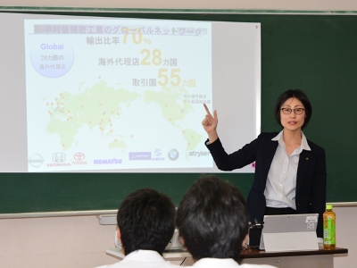 講師の皆様の話しぶりから、会社を愛し、仕事に誇りを持ち、地域貢献に自信を持つ様子が伝わってきました。アメリカやイギリスに海外勤務する二水の卒業生たちの活躍を紹介してくださる会社もあり、生徒たちは熱心に聞き入っていました。