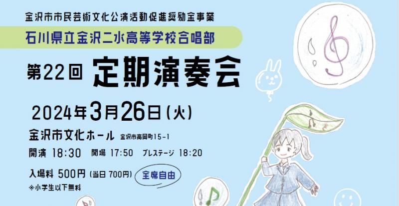 3月26日㈫18:30~(プレステージ18:20~)金沢市文化ホールにおいて石川県立金沢二水高等学校合唱部第22回定期演奏会を開催する運びとなりました。令和6年能登半島地震で被災した皆様の少しでも役に立てるように、演奏会当日は募金箱を設置し、チケット収入やOBOG協賛金の一部と合わせて義援金を送る予定です。また被災された方で演奏会観覧希望の方がいらっしゃれば、無料でご招待いたしますので、下記申込よりぜひご応募ください。今回は県内高校で音楽教諭としてご活躍中の本校合唱部65期卒業生、大久保翔貴先生を客演指揮としてお招きし、広くOBOGを募って合同ステージを設ける予定で、5年ぶりとなるマスクなしの演奏会です。OBOGの方もまだまだ募集中なので1曲からでもステージでご一緒できる方は今月中に申し込みをお願いします。チケットは500円(当日700円)で販売しておりますので、本校部員から購入するか、下記に必要事項を記入していただければ対応いたします。たくさんのご来場お待ちしています!