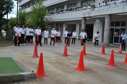 家庭調理室での火災発生を想定し、生徒、教職員が迅速に避難行動ができるようにするための訓練です。また、金沢市中央消防署の方にご指導いただき、水消火器を使った消火訓練も行われました。