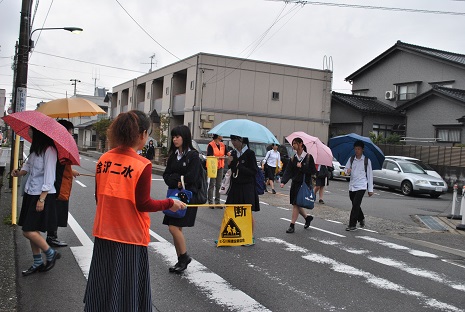 雨天時の自転車走行は、地面も滑りやすく、大変危険です。また、傘差し運転はれっきとした道路交通法違反です!雨の日は、時間に余裕を持って、普段よりも気をつけて登校して下さいね。