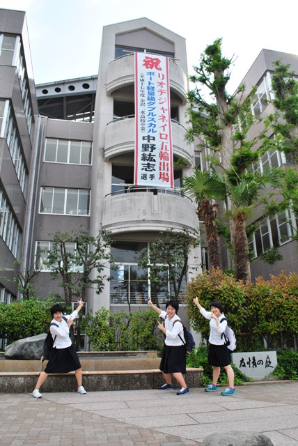 リオ五輪出場が決定した中野紘志選手(ボート競技軽量級ダブルスカル、平成17年度二水高校卒業生)を応援する大懸垂幕が生徒会、同窓会より寄贈され、このほど本校東階段ベランダにお披露目されました。リオでは実力を遺憾なく発揮していただけるよう、全校あげて応援しています!