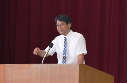 学年主任からのあいさつの後、進路指導課長より、来年度の大学入試センター試験の日程や出願手続きなどに関する説明が行われ、9月のセンター試験出願から1月末の国公立大学出願までの日程と、保護者として留意すべき点について、理解を深めていただきました。