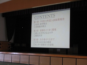 説明会の主な内容は、①平成24年度入試結果の報告、②受験をとりまく環境、 ③来春までの1年間の進路日程 の3点でした。「 生徒が高い進路目標を設定して、早い時期から受験対策に取り組み、受験を通じて人間的な成長を遂げることを期待している」と保護者の方々にお伝えしました。