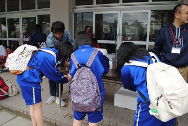 放送による指示で、安全行動 DROP! (姿勢を低く)、COVER! (頭・体を守って)HOLD ON! (じっとして)、を生徒・教職員全員で行いました。