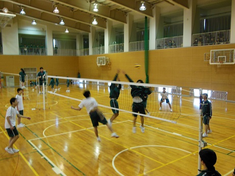 1年生の校内球技大会を3月17日(木)に行いました。開会式の後、準備体操を終えた生徒たちは、バレーボール、バスケットボール、バドミントン、卓球の各競技に出場し、どのクラスも優勝をめざして熱戦が繰り広げられました。