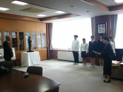 寄贈式には生徒を代表して生徒会執行部が同席しました。後期生徒会長西内くんは「この素晴らしい像を大切にしていきたい。」とお礼の言葉を伝えました。