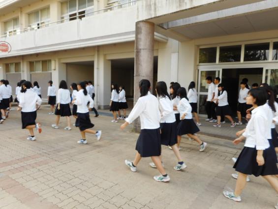 【真剣に避難する生徒たち】 【校長先生からの避難に要した時間の発表と全体講評】