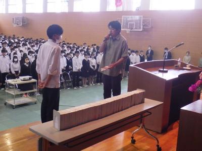 集英社吉田様から本校代表生徒宮下拓也さんに、永田先生のサイン入り御著書が手渡され、宮下さんが「大切に有効に利用させていただきます」とお礼の言葉を述べました。