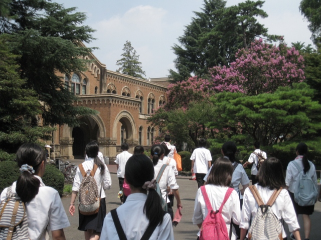 明治以来の歴史的建造物の重み、「銀杏散る真っ只中に法科あり」(山口青邨)の俳句を思い出させる法科の銀杏並木を始めとする巨樹の数々が作り出す緑陰のありがたさをしみじみと感じつつ、路線バスの終点もある広大な敷地を、東大生の熱心な説明に耳を傾けながら歩きました。安田講堂の圧倒的な存在感にしばし絶句する生徒達の様子が、特に印象深いものでした。