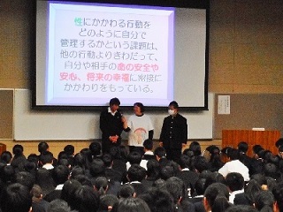 講話の後半では代表生徒2名が妊婦疑似体験をし、「少しの間ではあったが腰などが痛くなった。将来自分のパートナーが妊娠したら、支えてあげたい」と感想を述べていました。