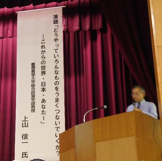生き方セミナーが行われました 投稿日時 : 2019/11/16 スーパー 10月11日(金)午後、今年度の『生き方セミナー』が開催されました。このセミナーは、「青年期の生き方・あり方について考え、社会に対する認識を深めるとともに、自己の将来を考える良い機会とする」ことを目的に、毎年開催している講演会です。今年度は、慶應義塾大学総合政策学部より上山信一教授を講師としてお迎えし、『 どうやっていろんなものをつないでいくか? ― これからの世界・日本・あなた ― 』と題する講演をしていただきました。全校生徒、職員、同窓生、合わせて約1300名が講演を拝聴しました。