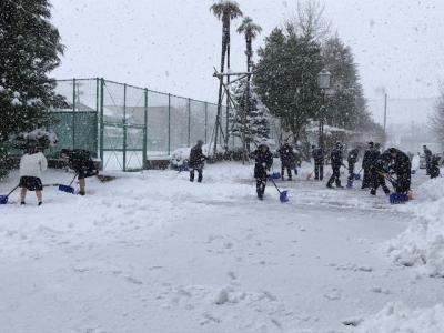 昨日は「10年に1度の大寒波」の影響で休校でした。今朝も雪。昨日ほど凍結はしていませんが、歩道には雪が積もり、学校の正門から生徒玄関までには2日分の雪が積もっていました。その雪を、朝早くから、野球部の生徒たちと先生方がきれいに雪かきしてくれました。これで全校の生徒たちは、足下を気にすることなく安全に登校できます。皆さん、本当にありがとうございます。