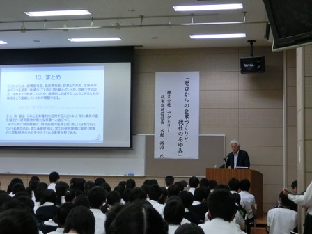 株式会社アクトリー代表取締役社長の水越裕治氏を講師として招き、「ゼロからの企業づくりと我社のあゆみ」という演題で講演をしていただきました。会社で取り組んでいる内容や、水越社長がどのように会社を築きあげたかなど話していただきました。