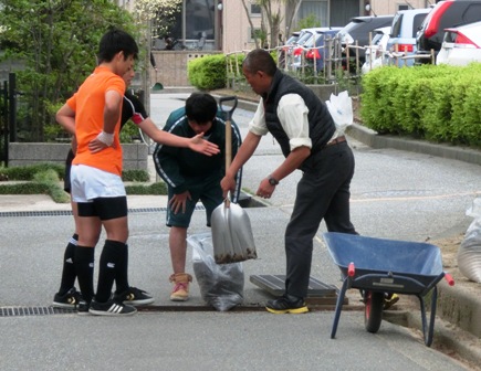 昨日の暴風により本校グラウンドから大量の砂が飛散し、近隣の道路やご近所の敷地内にたまってしまいました。さっそく放課後にラグビー部、サッカー部の部員たちに先生方も応援に加わり、砂の撤去作業を行いました。