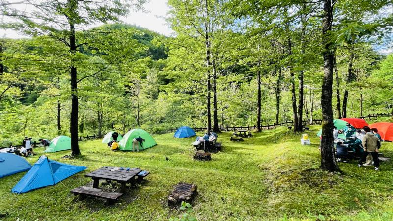 南竜ヶ馬場野営場につくと、山開きしてすぐにもかかわらず、すでに多くのテントが張ってあり、白山の人気の高さがうかがえました。途中、通り雨にもあいながらもテント設営や夕食作りを手際よく進め、無事に夜を迎えられました。