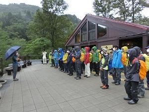 二日目の天気は雨。そのため、白山に登る予定を変更し、別の低山に登りました。登る山が変更になっても生徒たちは動じることなく、準備に取り掛かっていました。上りで約1時間、下りで約40分というかなり短い登山となりましたが、前の生徒との距離や足場の状態を意識しながら安全に登ることができました。
