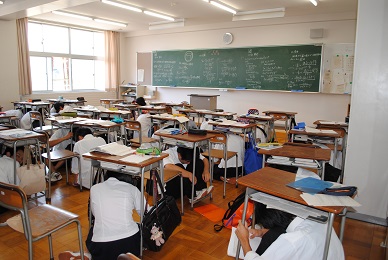 7月10日「シェイクアウトいしかわ」を実施しました。シェイクアウトとは、アメリカで始まった地震防災訓練です。3時間目の途中に放送による指示が入ると、全校生徒は一斉に「DROP!COVER!HOLD ON!」の3ステップの安全行動を取りました。