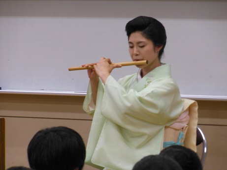 中村玲子会長の唐子先生のご紹介、邦楽全般についての解説のあと、「荒城の月」や闇笛など三曲を披露していただき、生徒たちは日ごろ耳にしない横笛の音色に静かに耳を傾けました。唐子先生は、大学在学時に篠笛を習い始めたということでした。