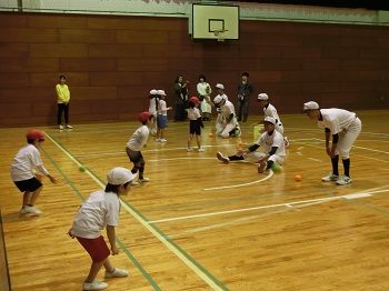 しかし、本校体育館に到着して一緒に『おにごっこ』をしてからは一気に打ち解け、その後は『やわらかボールを投げてみよう!』『ストラックアウトに挑戦!』『かっとばせ!ホームラン!』などの活動を楽しみました。バットを振ったりボールを投げたり、園児たちは高校生との野球遊びに夢中になっていました。