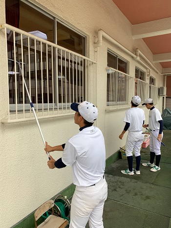 本校の清掃ボランティア活動「二水LIVE」に野球部も参加し、近所の保育園を訪れて窓や床の清掃に取り組みました。慣れない作業ではあったものの、活動を通して、人の役に立つことの喜びややりがいを感じることができました。