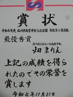 本校生徒(畑まりん・2年)が、最優秀賞を受賞!