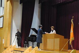 (4)からたち賞授与式・・・本校同窓会が、部活動、学習活動、生徒会活動などで顕著な成績や功績のあった生徒や団体を表彰するもので、小川陽子同窓会長から2団体、3個人に授与されました。
