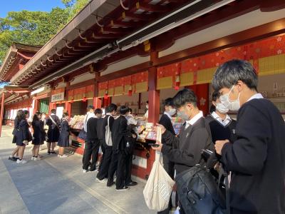 太宰府天満宮では参拝後、御守りを買ったり、おみくじをしたりして、楽しんでいました。また、参道では梅ヶ枝餅やソフトクリームなど甘いものを食べ歩く生徒も多くいました。
