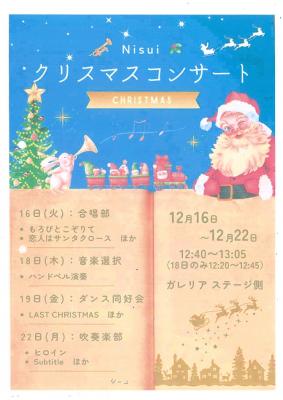 クリスマス・コンサート、開幕 投稿日時 : 12/16 生徒課 クリスマスまで、あとわずか。 今年も本校ガレリア内ステージで「クリスマス コンサート」が行なわれます。 ♪合唱部、音楽選択者、ダンス同好会、吹奏楽部がクリスマスにふさわしい発表をします♪