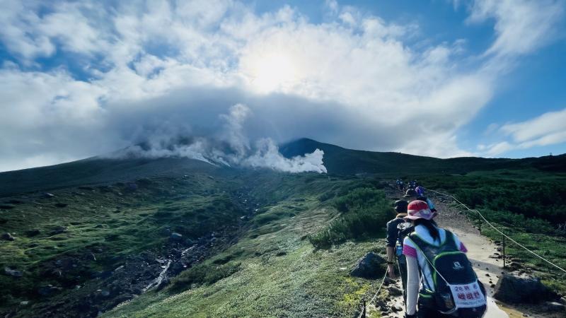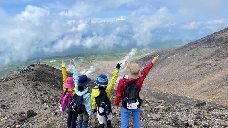 北海道とは思えないほど気温が高くなり、厚さとの戦いとなった登山でした。最後のチェックポイントで多くのチームが離脱するなか、生徒たちは最後の力をふり絞って無事に登頂することができました。山頂ではガスがかかり、展望は望めませんでしたが、下山中にはガスも晴れ北海道の雄大な景色を見ることができました。
