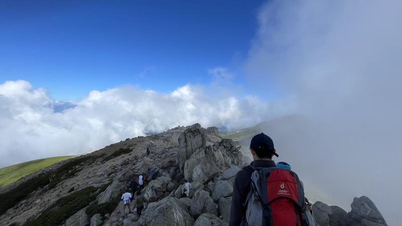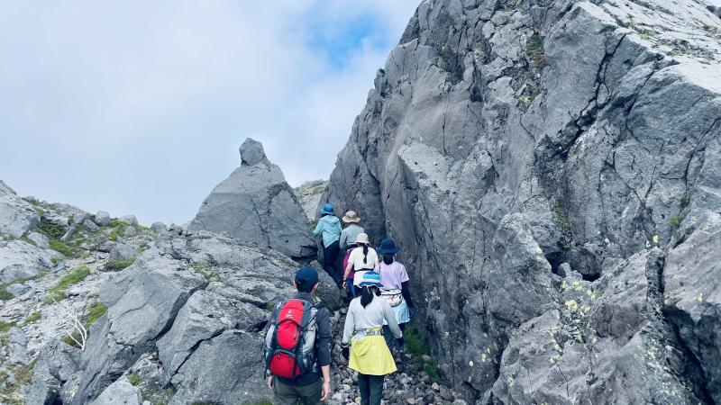 テント泊のため、いつもよりも出発時間を遅くしての出発となりました。全国大会のメンバーとそれ以外のメンバーに分かれての登山活動とし、メンバーはペースを考えながら、メンバー以外は1年生のペースに合わせながら登ることができました。