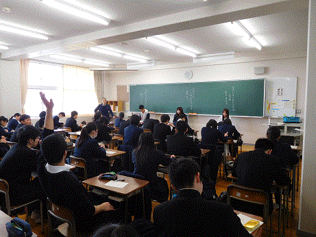 3月22日(木)の3・4限に卒業生の話を聞く会が行われました。今春合格した卒業生51名に、1年生・2年生の各教室で、自身の高校生活や受験について話をしてもらいました。合格した現在の気持ち、志望校を決めた時期、1年次・2年次の勉強法などについて、1年生・2年生は真剣に聞き入っていました。グループに分かれての質疑応答では、「通学時間の活用法は?」や「センター試験直前の過ごし方は?」などの悩みや疑問が出され、卒業生は自分達の経験をもとに、一つ一つ的確にアドバイスしていました。