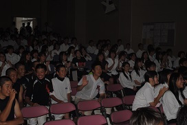 大分市で行われている今年のインターハイ陸上競技は2日目を迎え、女子100m競走決勝に、本校期待の神保祐希選手が登場。有名選手等の話題性もあってテレビ生中継される中、第6レーンに姿を現した神保選手は、後半よく粘り、4着でゴールイン。タイムは12秒01。本校視聴覚室には、学校に残っていた約300人の生徒が勉強や部活動を中断して集結。先生方とともに、「神保、神保、・・・」の大合唱で声援を送り、神保選手のレースを見守った。