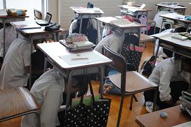 放送による指示で、安全行動 ①DROP! (姿勢を低く)、②COVER! (頭・体を守って)、③HOLD ON! (じっとして)、を生徒・教職員全員で行いました。