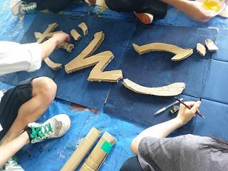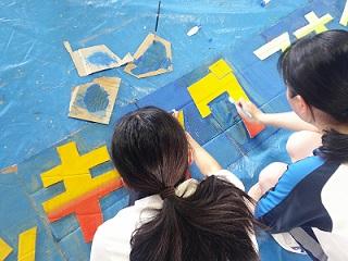 各クラスの催しに合わせた看板・のぼり旗などの装飾を作成中