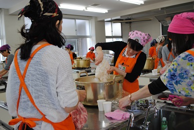 PTA役員・理事を中心に50名の保護者が、朝から1400食分のめった汁を大鍋28個で調理し、冷たい麦茶とともに帰ってきた生徒達にふるまいました。